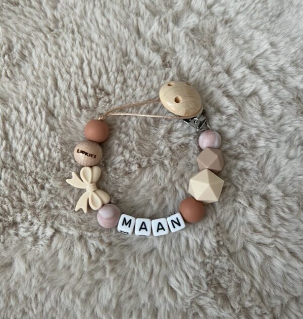 Vanwege de veiligheidseisen mag het speenkoord maximaal 22 cm zijn (clip niet meegerekend). Indien dit speenkoord besteld wordt met een naam die meer dan 6 letters heeft dan zal de samenstelling iets veranderen. De stijl blijft uiteraard hetzelfde.