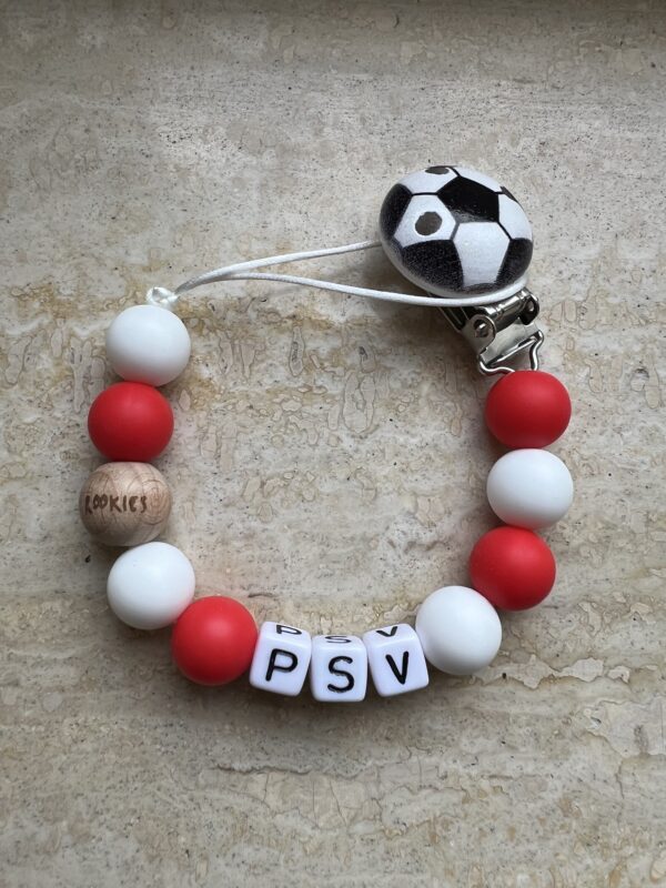 Dit handgemaakte speenkoord naar een uniek PSV design van Rookies is een echte musthave voor jouw kindje!