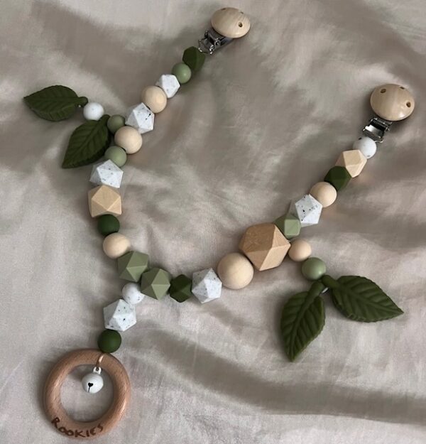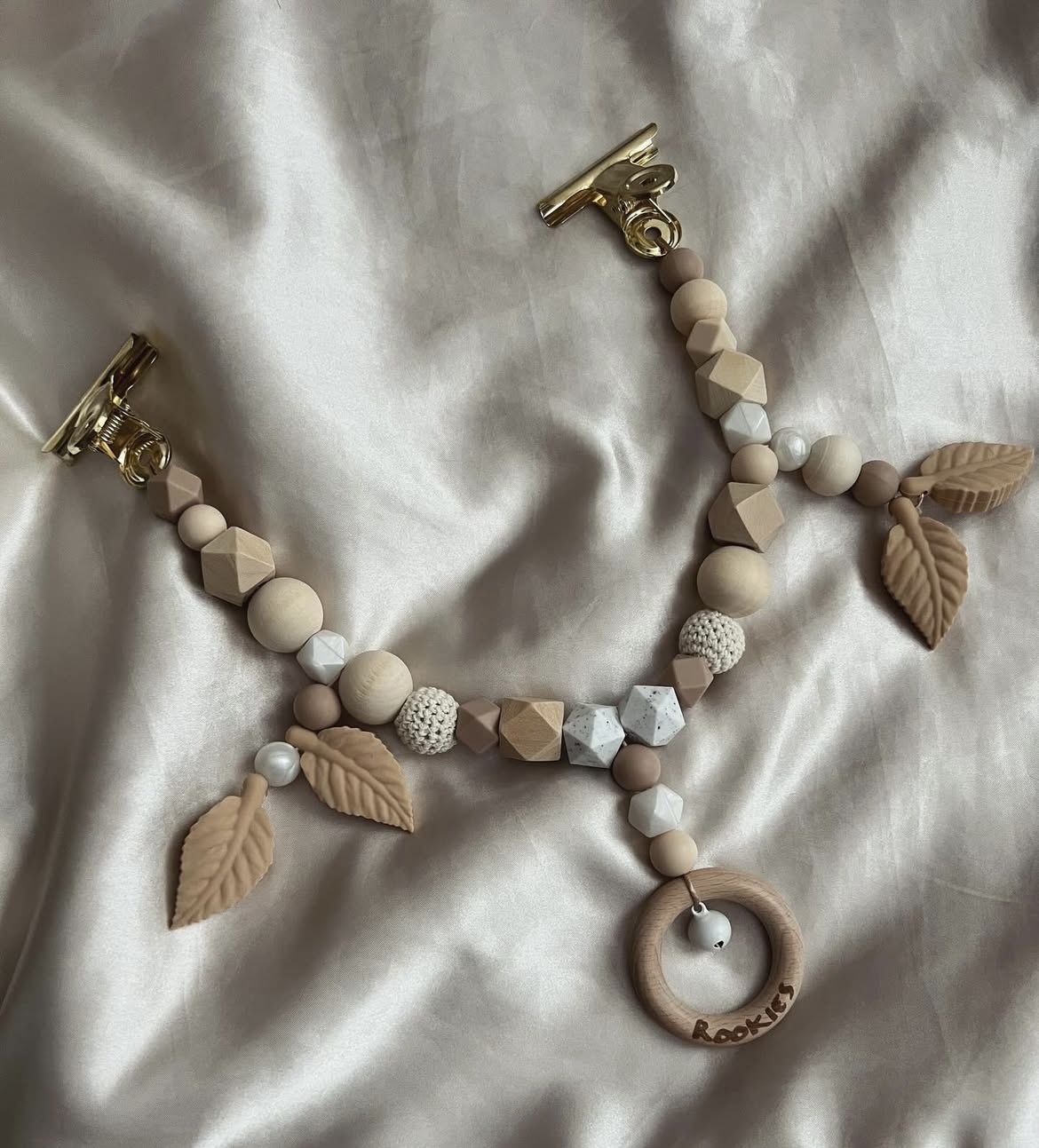 Deze wagenspanner is gemaakt van volledig veilige en gecertificeerde materialen, zoals: satijnkoord, siliconen kralen, houten kralen, acryl letterkralen en houten clips.